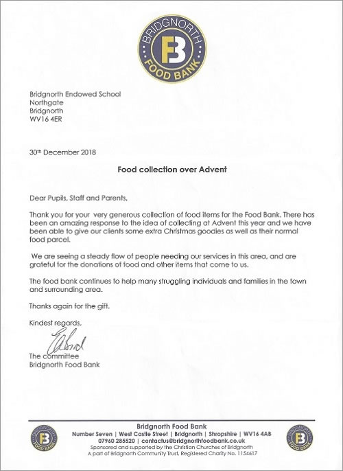 Bridgnorth Food Bank has sent a letter of thanks to Bridgnorth Endowed School pupils, parents and staff for the generous contributions that were collected at a school event held in December.